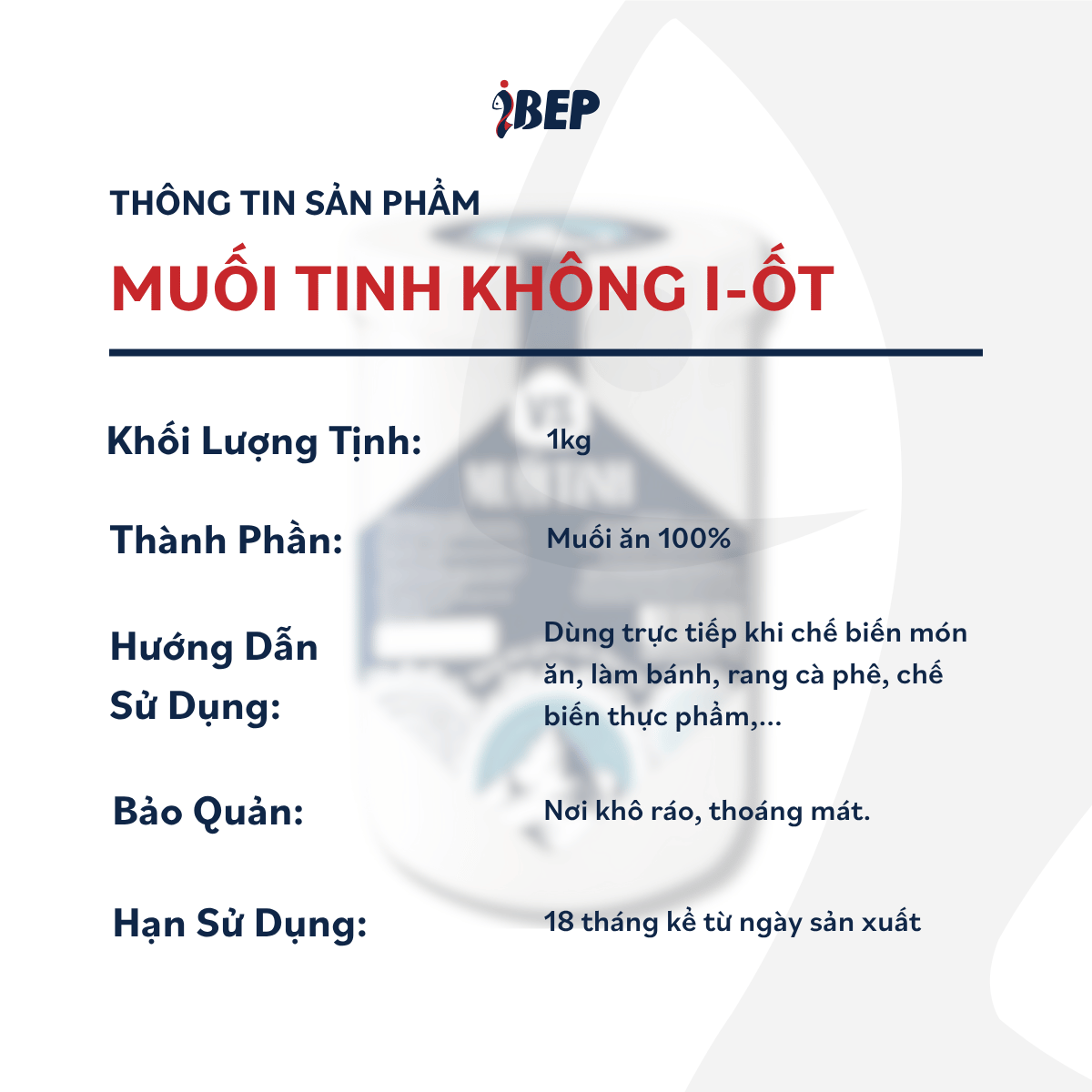 Muối tinh khiết iBep là loại muối trắng hạt mịn, khô ráo, không vón cục, với độ mặn cao gấp 4–5 lần muối thông thường. Phù hợp để dùng trong làm bánh và nấu ăn hàng ngày. Đây là muối không I-ốt nhưng vẫn giữ khoáng chất tự nhiên, giúp cơ thể duy trì lượng I-ốt cân bằng, hạn chế tình trạng dư thừa gây ảnh hưởng sức khỏe.