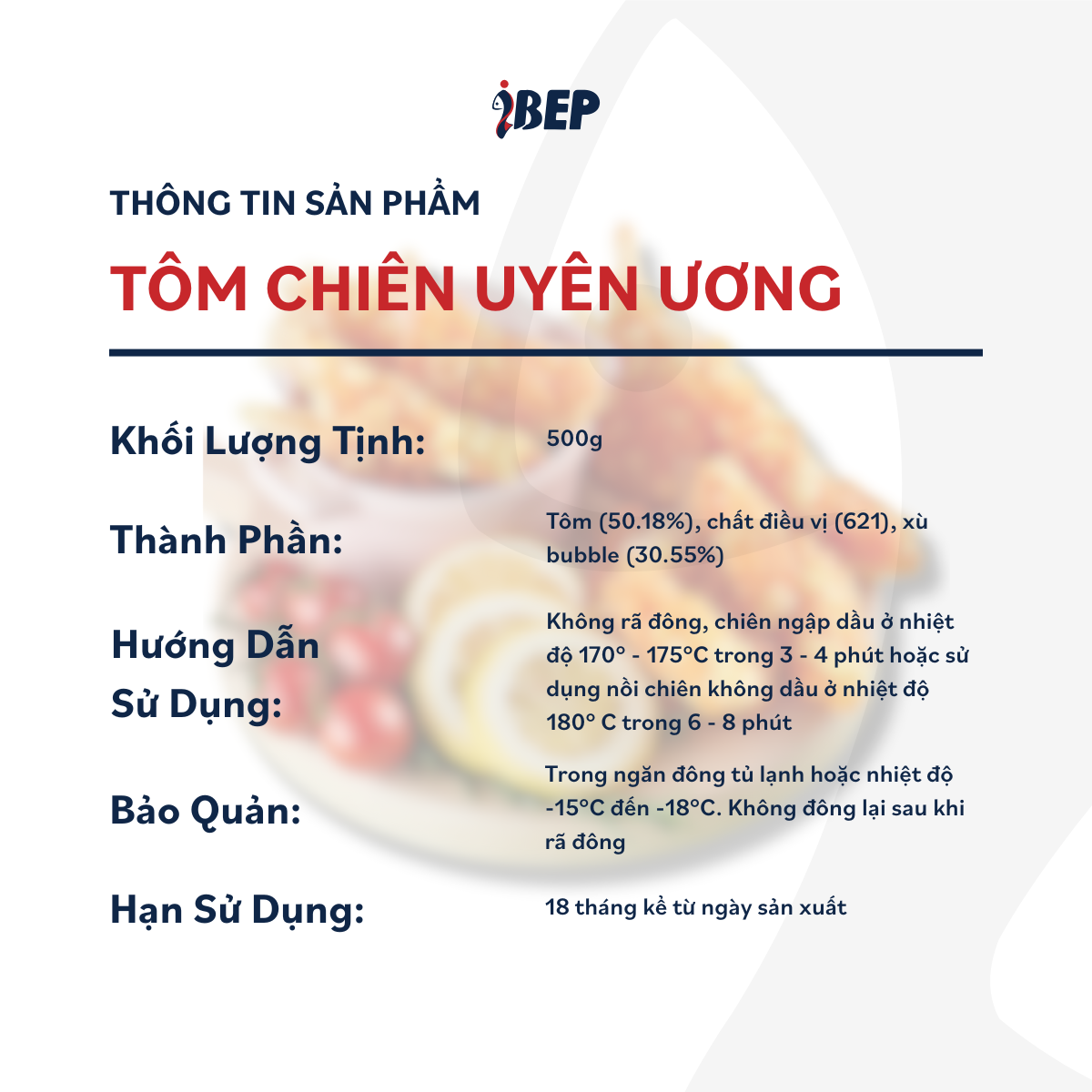 Tôm Chiên Uyên Ương iBep được làm từ những con tôm tươi, thịt mọng nước, vị dai ngọt tự nhiên. Bên ngoài phủ lớp vỏ bột xù Bubble màu vàng cam bắt mắt. Khi ăn sẽ khiến cho nhiều người phải nhớ mãi hương vị đặc trưng ngay lần đầu tiên thưởng thức.
